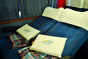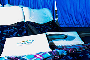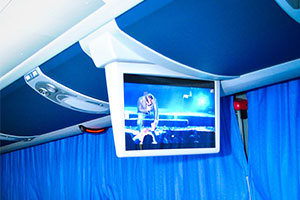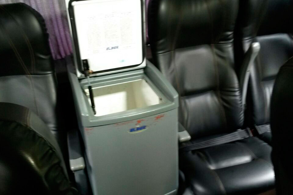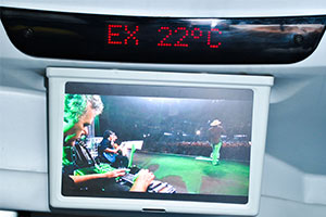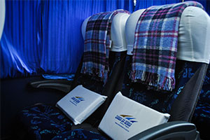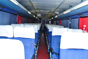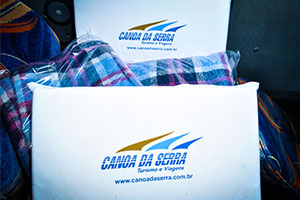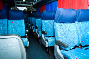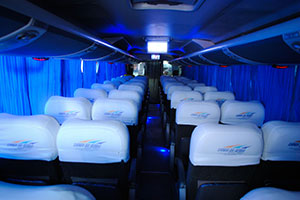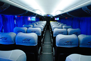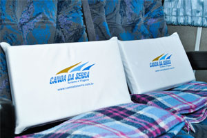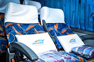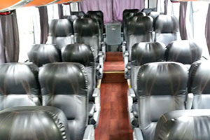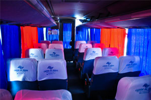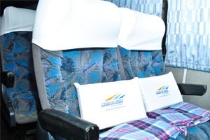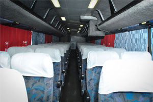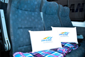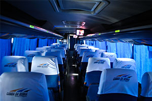 Capacidade para 40 e 42 passageiros. Ônibus super modernos, equipados com ar condicionado, TV, DVD, CD player, microfone, poltronas reclináveis com descanso para pernas, frigobar, toalete, conservas para bebidas quentes e frias.